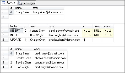 <span style="font-family: Lucida Console;"><span style="color: #008000;">--// Create our SOURCE table</span> <span style="color: #0000ff;">DECLARE </span><span style="color: #000000;">@t1 </span><span style="color: #0000ff;">TABLE </span><span style="color: #000000;">(</span> <span style="color: #000000;">id </span><span style="color: #008080;">int</span><span style="color: #000000;">,</span> <span style="color: #000000;">name </span><span style="color: #008080;">nvarchar</span><span style="color: #000000;">(16),</span> <span style="color: #000000;">email </span><span style="color: #008080;">nvarchar</span><span style="color: #000000;">(32)</span> <span style="color: #000000;">)</span></span> <span style="font-family: Lucida Console;"><span style="color: #008000;">--// Create our TARGET table</span> <span style="color: #0000ff;">DECLARE </span><span style="color: #000000;">@t2 </span><span style="color: #0000ff;">TABLE </span><span style="color: #000000;">(</span> <span style="color: #000000;">id </span><span style="color: #008080;">int</span><span style="color: #000000;">,</span> <span style="color: #000000;">name </span><span style="color: #008080;">nvarchar</span><span style="color: #000000;">(16),</span> <span style="color: #000000;">email </span><span style="color: #008080;">nvarchar</span><span style="color: #000000;">(32)</span> <span style="color: #000000;">)</span></span> <span style="font-family: Lucida Console;"><span style="color: #008000;">--// Insert values into SOURCE table</span> <span style="color: #0000ff;">INSERT INTO </span><span style="color: #000000;">@t1 </span><span style="color: #0000ff;">VALUES </span><span style="color: #000000;">(1, </span><span style="color: #ff00ff;">'Charles Chen'</span><span style="color: #000000;">, </span><span style="color: #ff00ff;">'charles.chen@domain.com'</span><span style="color: #000000;">)</span> <span style="color: #0000ff;">INSERT INTO </span><span style="color: #000000;">@t1 </span><span style="color: #0000ff;">VALUES </span><span style="color: #000000;">(2, </span><span style="color: #ff00ff;">'Sandra Chen'</span><span style="color: #000000;">, </span><span style="color: #ff00ff;">'sandra.chen@domain.com'</span><span style="color: #000000;">)</span> <span style="color: #0000ff;">INSERT INTO </span><span style="color: #000000;">@t1 </span><span style="color: #0000ff;">VALUES </span><span style="color: #000000;">(3, </span><span style="color: #ff00ff;">'Brad Wright'</span><span style="color: #000000;">, </span><span style="color: #ff00ff;">'brad.wright@domain.com'</span><span style="color: #000000;">)</span></span> <span style="font-family: Lucida Console;"><span style="color: #008000;">--// Insert values into TARGET table</span> <span style="color: #0000ff;">INSERT INTO </span><span style="color: #000000;">@t2 </span><span style="color: #0000ff;">VALUES </span><span style="color: #000000;">(4, </span><span style="color: #ff00ff;">'Brady Sines'</span><span style="color: #000000;">, </span><span style="color: #ff00ff;">'brady.sines@domain.com'</span><span style="color: #000000;">)</span> <span style="color: #0000ff;">INSERT INTO </span><span style="color: #000000;">@t2 </span><span style="color: #0000ff;">VALUES </span><span style="color: #000000;">(1, </span><span style="color: #ff00ff;">''</span><span style="color: #000000;">, </span><span style="color: #ff00ff;">''</span><span style="color: #000000;">)</span></span> <span style="font-family: Lucida Console;"><span style="color: #008000;">--// Select values from the TARGET table (just to verify)</span> <span style="color: #0000ff;">SELECT </span><span style="color: #000000;">* </span><span style="color: #0000ff;">FROM </span><span style="color: #000000;">@t2</span></span> <span style="font-family: Lucida Console;"><span style="color: #008000;">--// Merge records from source to target</span> <span style="color: #0000ff;">MERGE</span> <span style="color: #000000;">@t2 </span><span style="color: #0000ff;">AS </span><span style="color: #000000;">[target]</span> <span style="color: #0000ff;">USING</span> <span style="color: #000000;">@t1 </span><span style="color: #0000ff;">AS </span><span style="color: #000000;">[source]</span> <span style="color: #0000ff;">ON</span> <span style="color: #000000;">([target].id = [source].id)</span> <span style="color: #0000ff;">WHEN NOT MATCHED BY TARGET</span> <span style="color: #0000ff;">THEN</span> <span style="color: #0000ff;">INSERT</span><span style="color: #000000;">(id, name, email)</span> <span style="color: #0000ff;">VALUES</span><span style="color: #000000;">([source].id, [source].name, [source].email)</span> <span style="color: #0000ff;">WHEN MATCHED</span> <span style="color: #0000ff;">THEN</span> <span style="color: #0000ff;">UPDATE SET</span> <span style="color: #000000;">[target].name = [source].name,</span> <span style="color: #000000;">[target].email = [source].email</span> <span style="color: #008000;">--// Get the journal of actions</span> <span style="color: #0000ff;">OUTPUT </span><span style="color: #000000;">$action, inserted.*, deleted.*;</span></span> <span style="font-family: Lucida Console;"><span style="color: #008000;">--// Grab the resultant table</span> <span style="color: #0000ff;">SELECT </span><span style="color: #000000;">* </span><span style="color: #0000ff;">FROM </span><span style="color: #000000;">@t2</span> </span> |