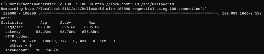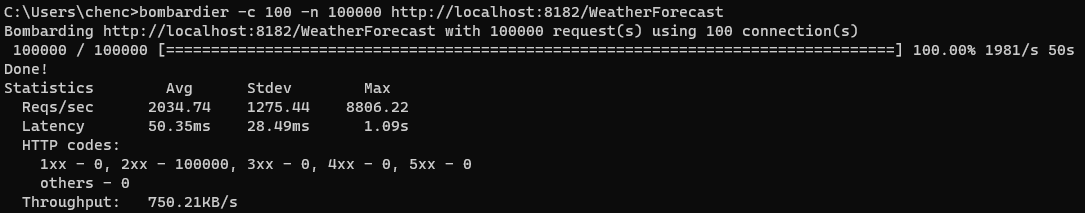 To test this, we’ll need to add an equivalent .NET Web API app and we’ll hit them both with 2 back-to-back passes using bombardier (the exact specs of the system and what not do not matter much I think since we’re interested in the relative results and I did not inject the HttpClient